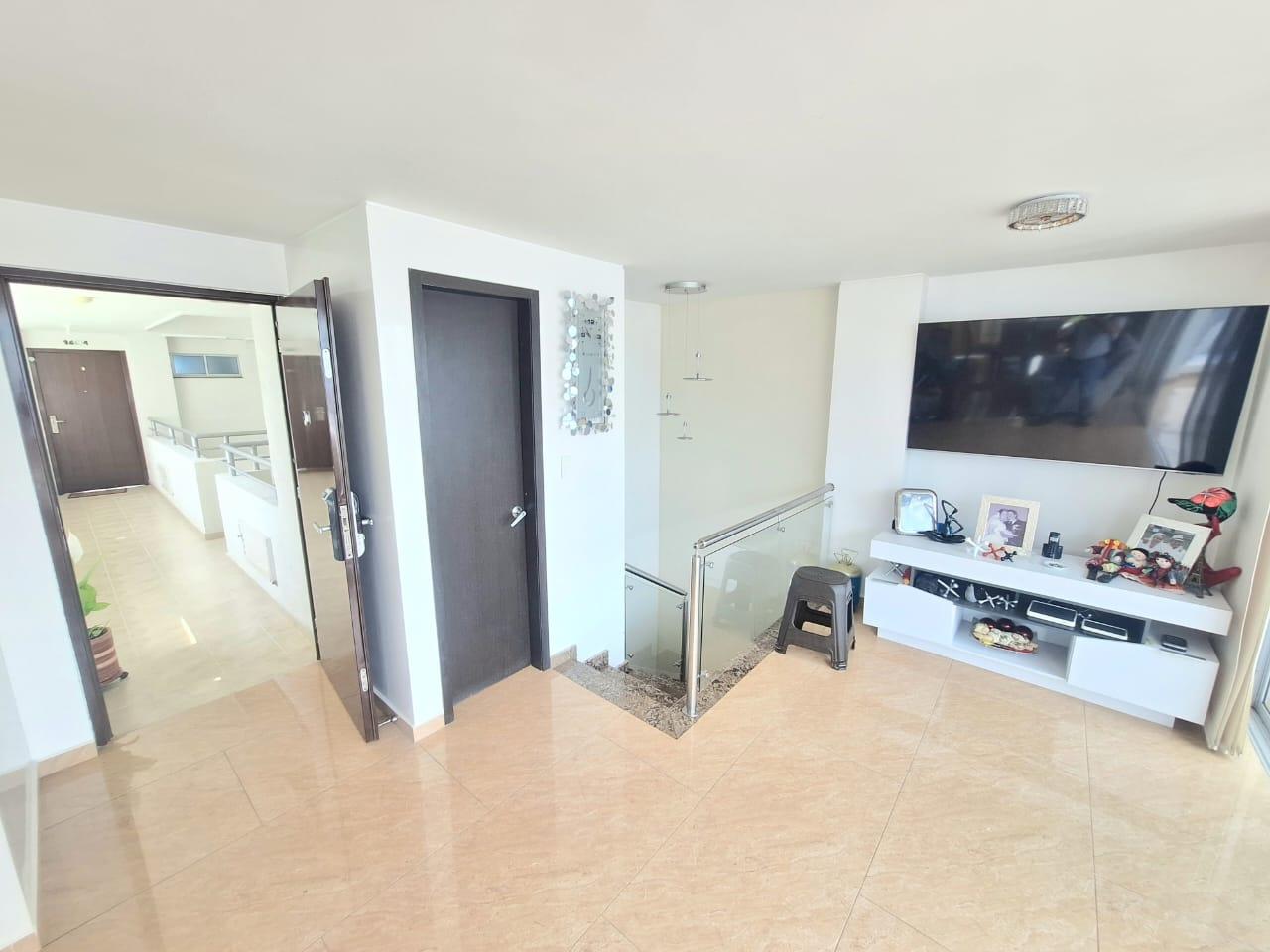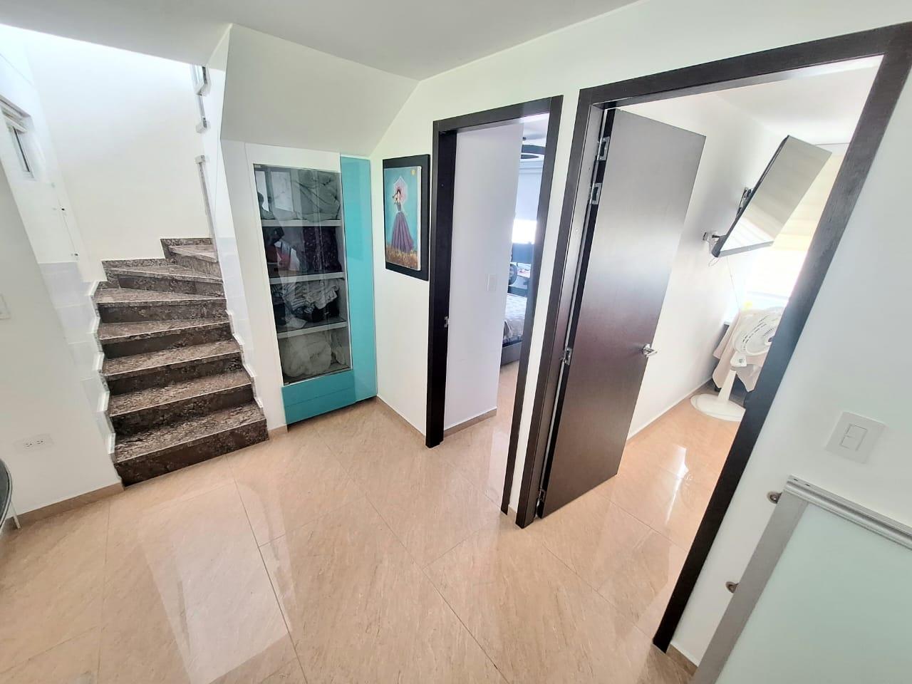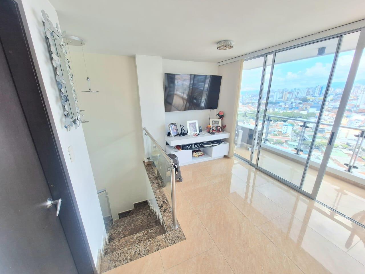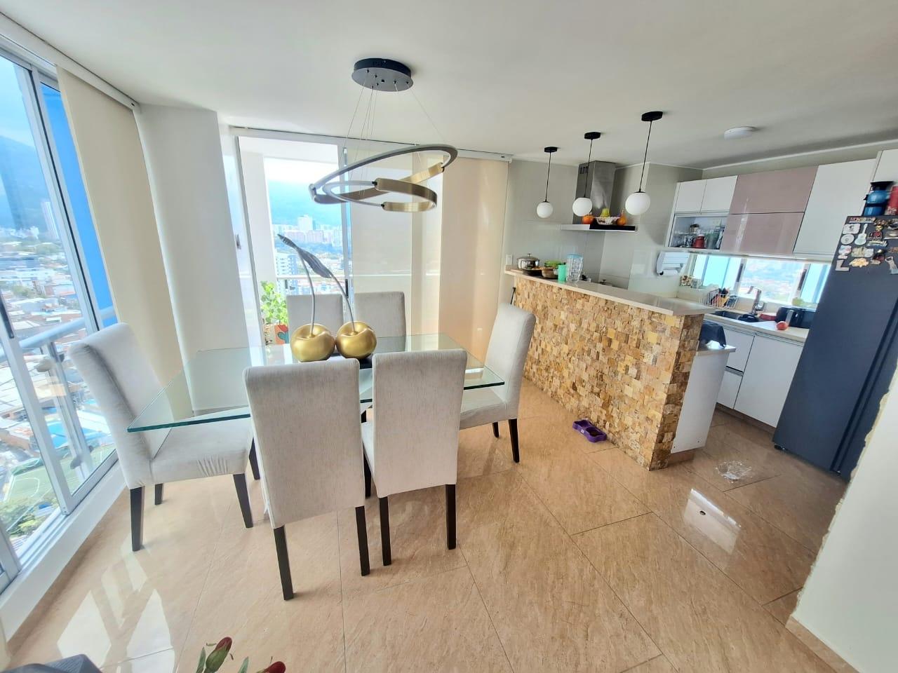 Upon entering, you'll find a spacious living and dining room. To the right of the entrance are balconies with fabulous views. Also to the right is the fully equipped kitchen with a breakfast bar, and behind it, the laundry area with a water heater and space for a washing machine. Before going downstairs, there's a guest bathroom without a shower. Downstairs, there's a study area, three bedrooms with closets, including the master bedroom, which features a walk-in closet and a large window with a balcony-style railing. The apartment has been remodeled, including the floors, bathrooms, closets, lighting, and tiling. The residential complex offers a complete social area with a gym, swimming pools, a jacuzzi, a BBQ area, a multi-sports court, a sauna, a children's playground, and 24-hour security. An additional parking space is available for an additional $25,000,000 COP.