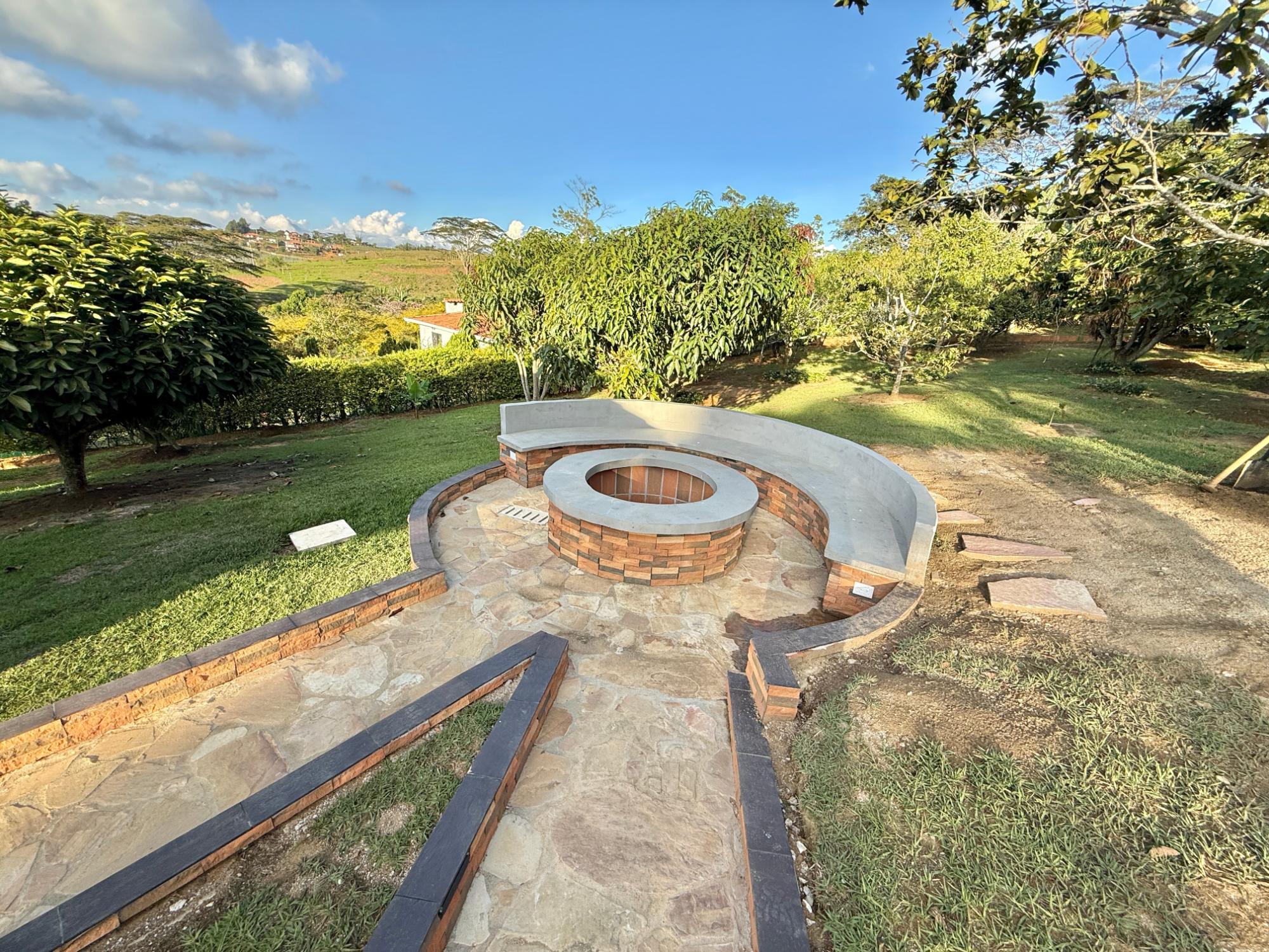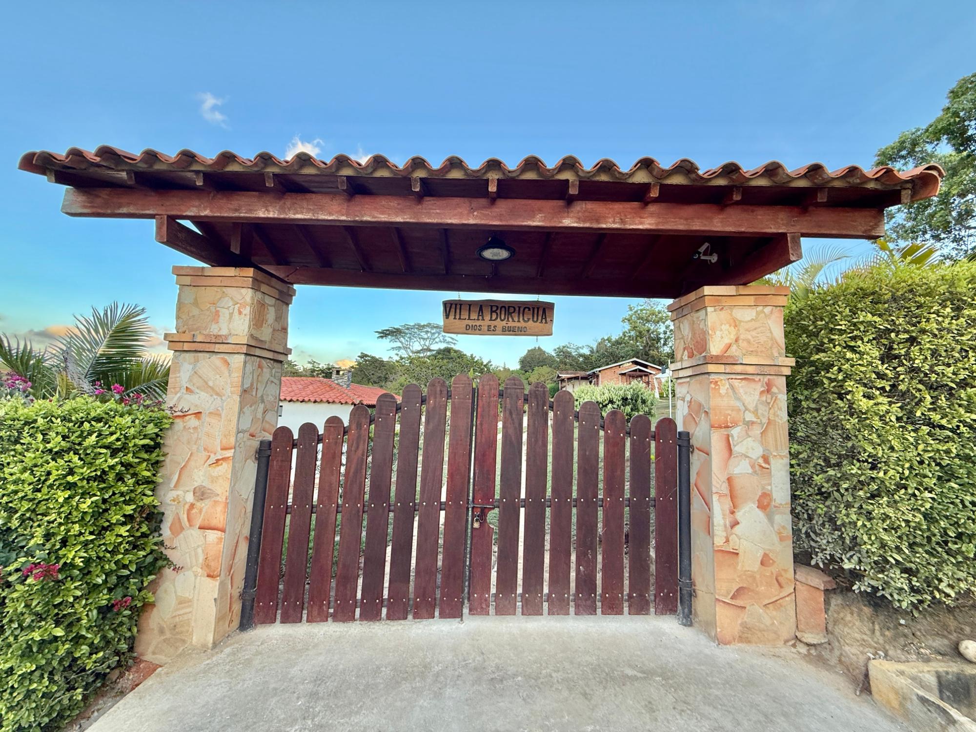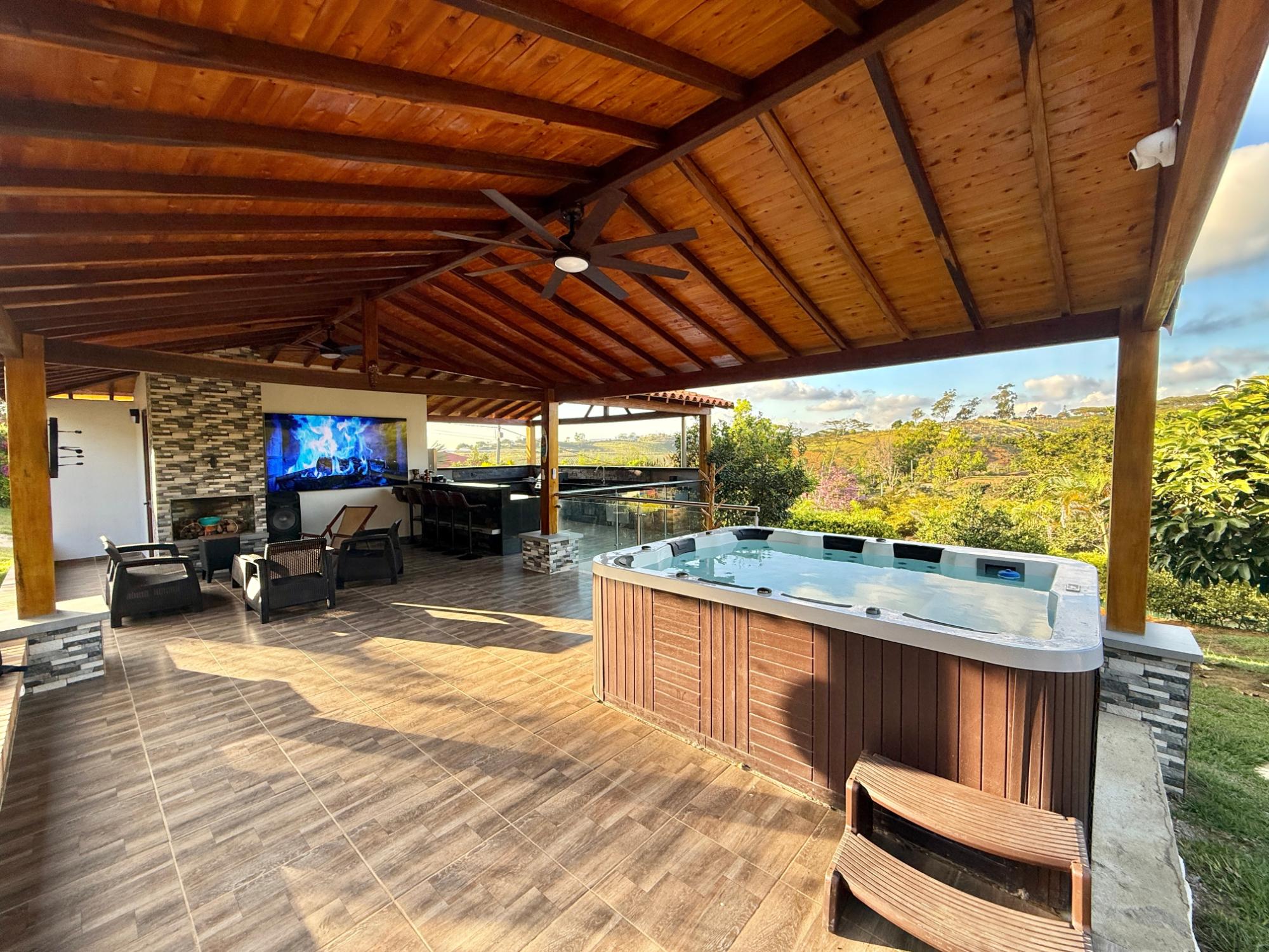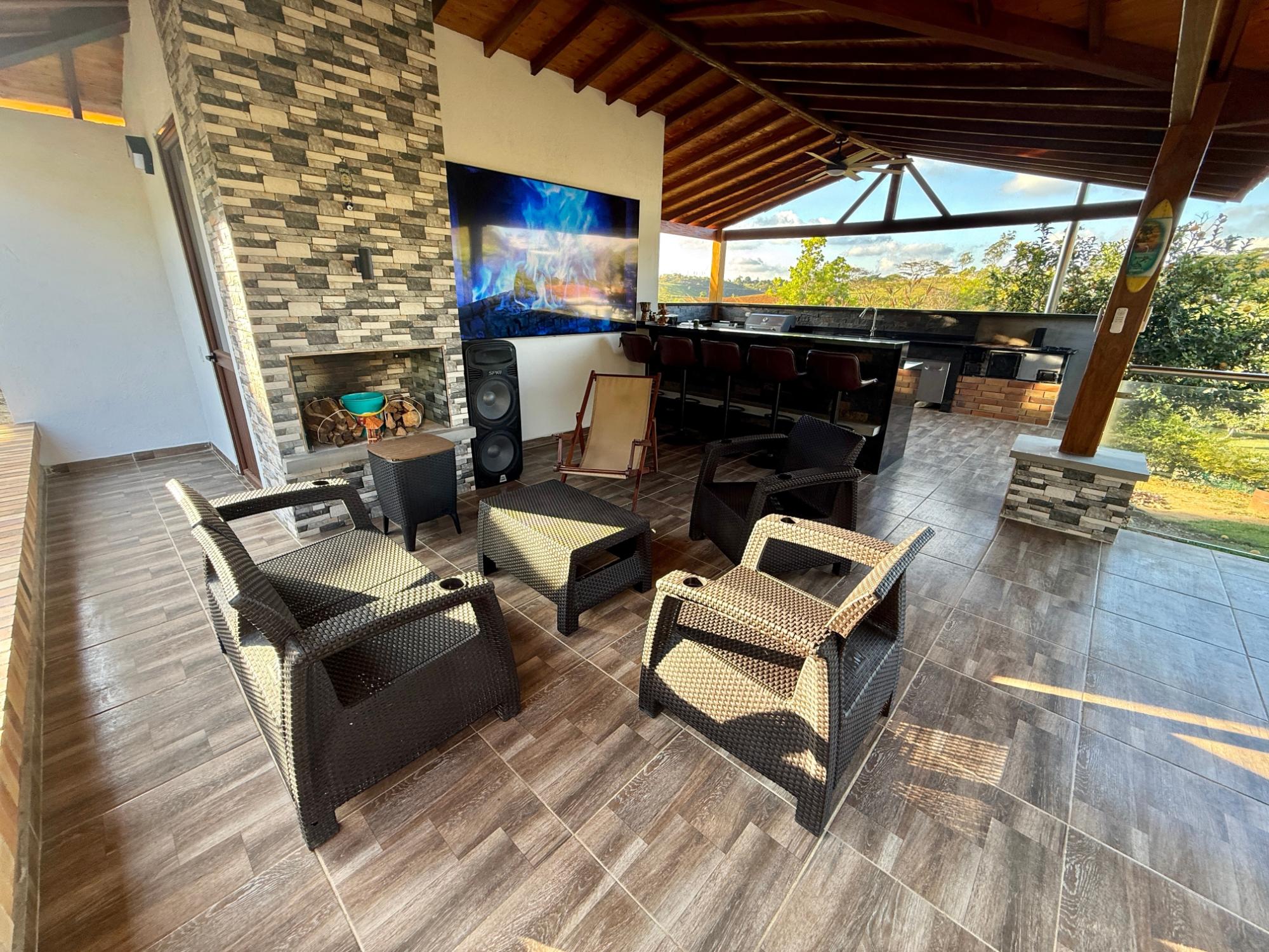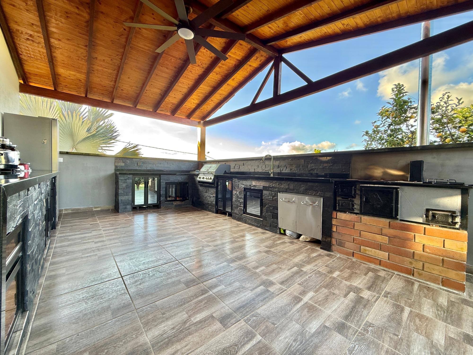 Beautiful villa with a well-maintained 3-bedroom house on the upper level, ample parking for vehicles, some fruit trees, and a recently constructed fire pit area, a super kiosk for enjoying family gatherings with a jacuzzi, a large living room with a fireplace, a spacious bathroom with hot water service, an American bar with its respective chairs, and a large kitchen with a built-in wood-fired oven, gas grill, stove, storage cabinets, and a refrigerator.