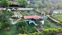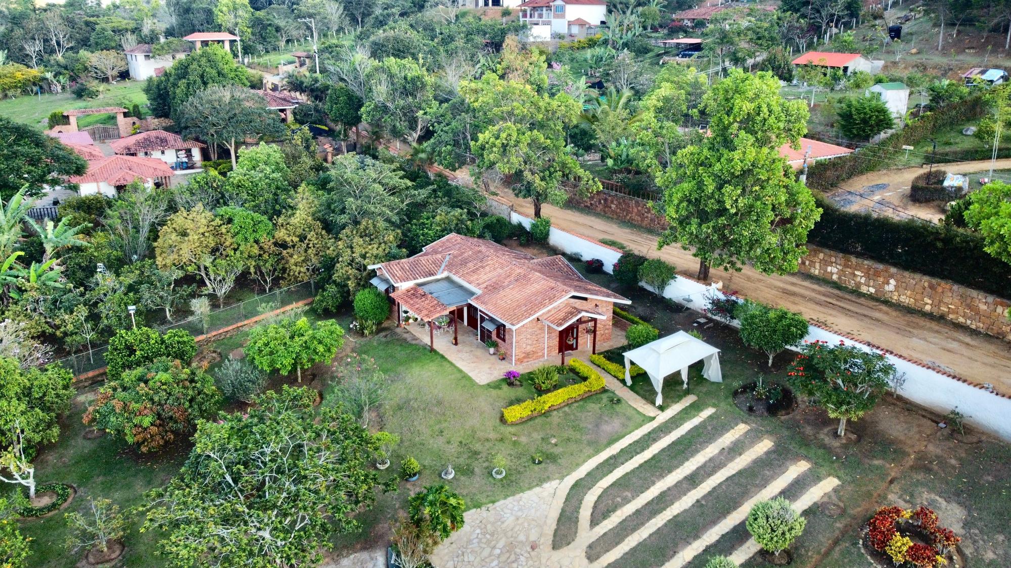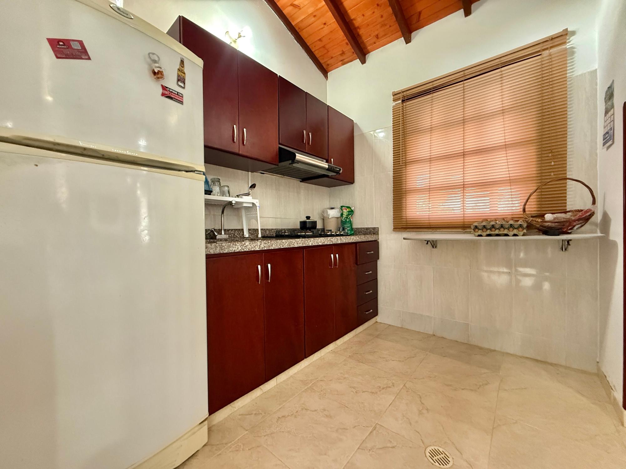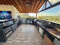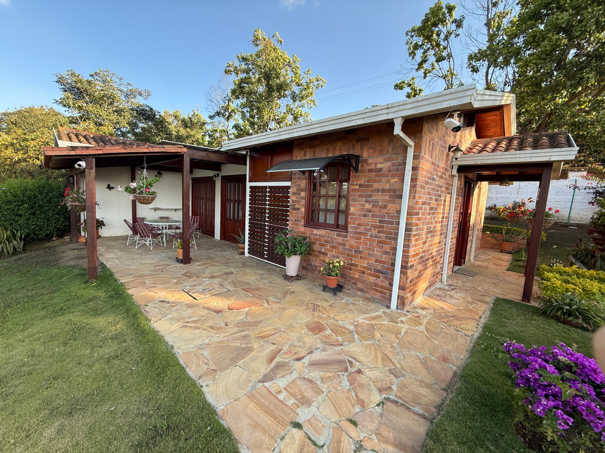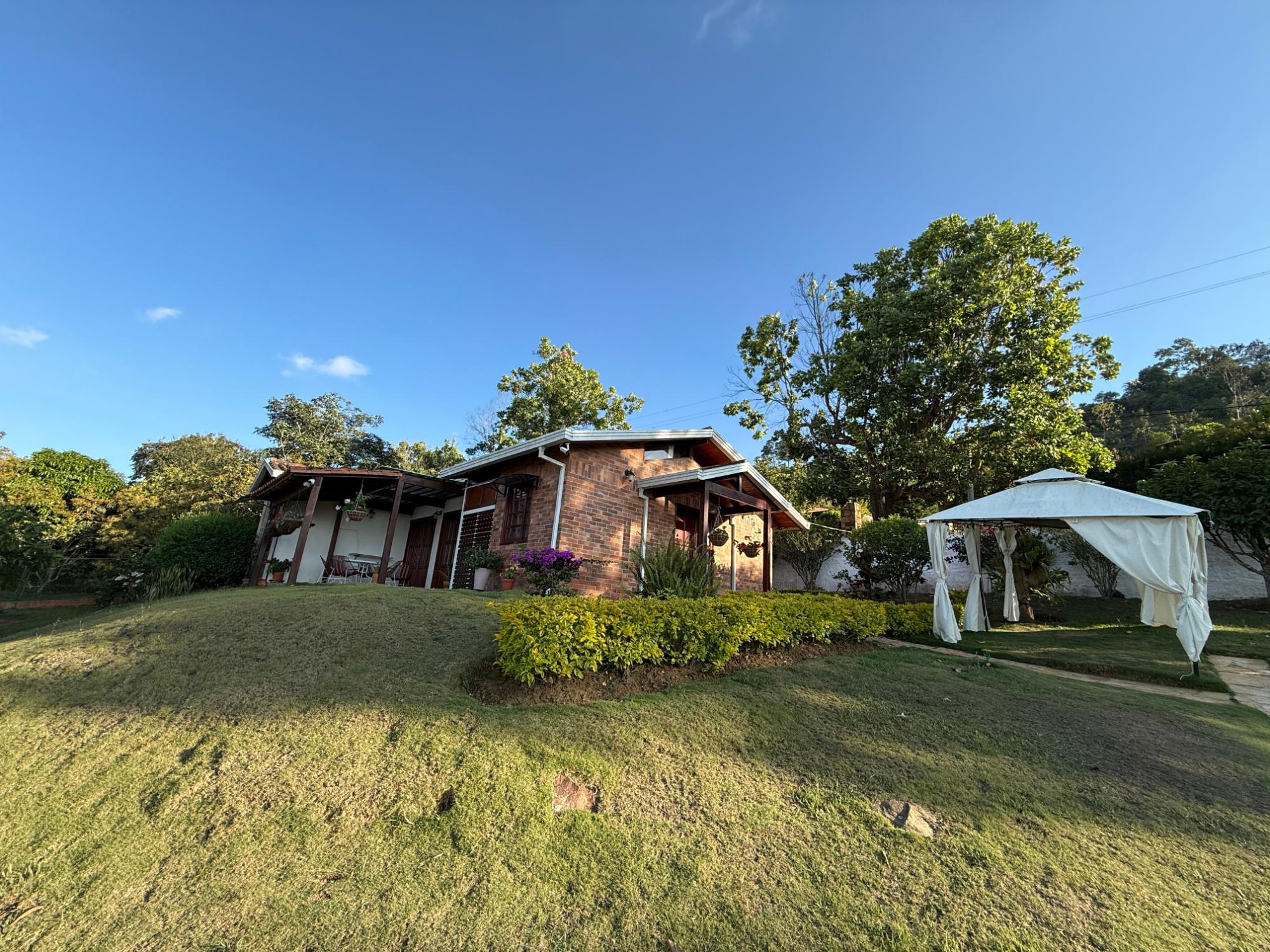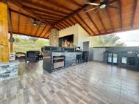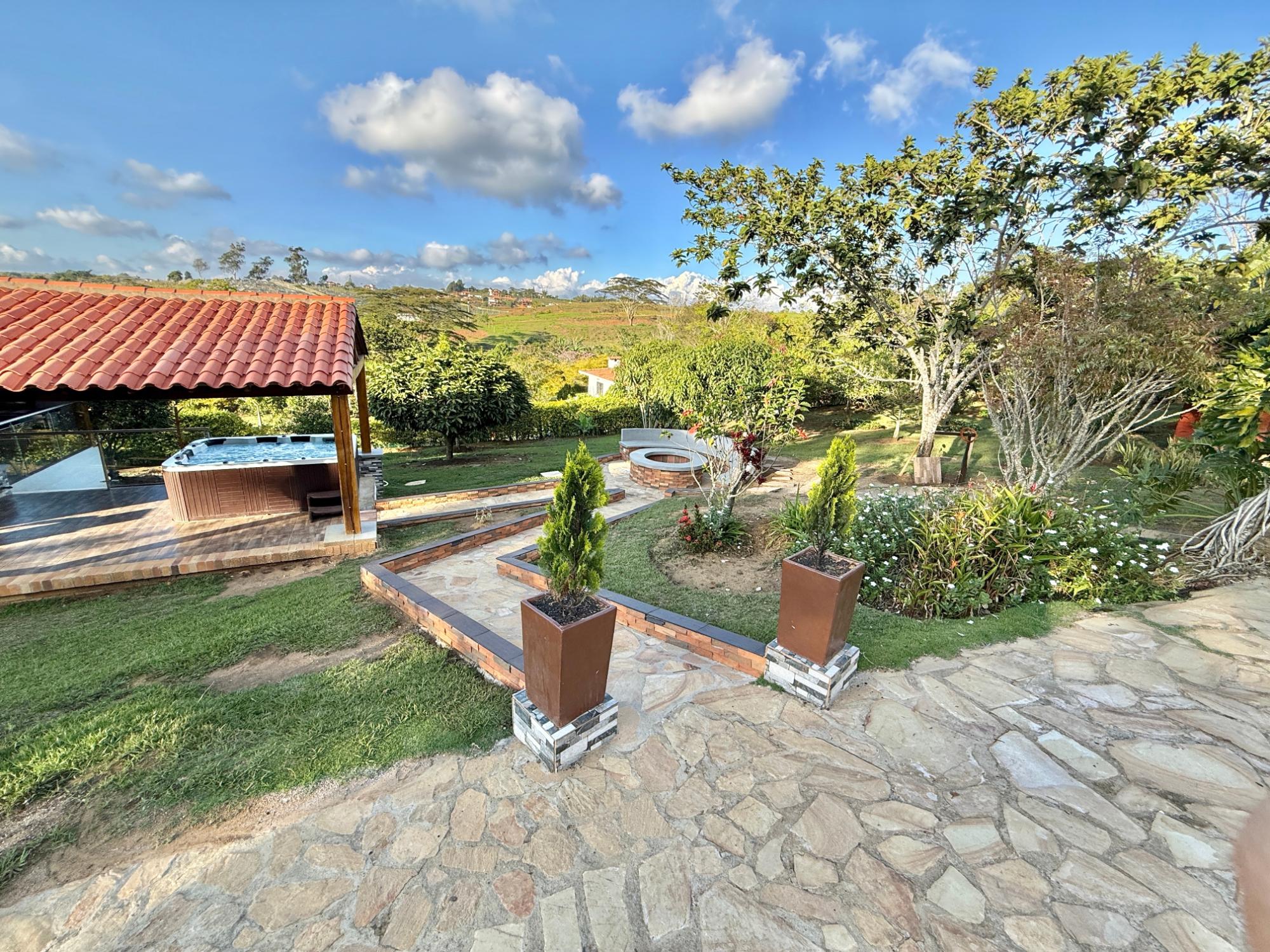 Beautiful villa with a well-maintained 3-bedroom house on the upper level, ample parking for vehicles, some fruit trees, and a recently constructed fire pit area, a super kiosk for enjoying family gatherings with a jacuzzi, a large living room with a fireplace, a spacious bathroom with hot water service, an American bar with its respective chairs, and a large kitchen with a built-in wood-fired oven, gas grill, stove, storage cabinets, and a refrigerator.