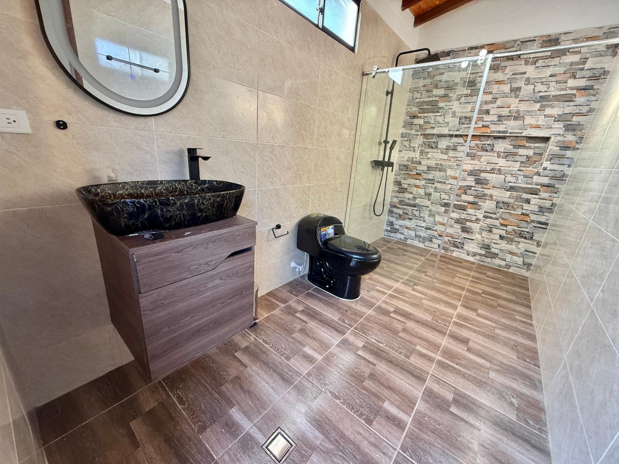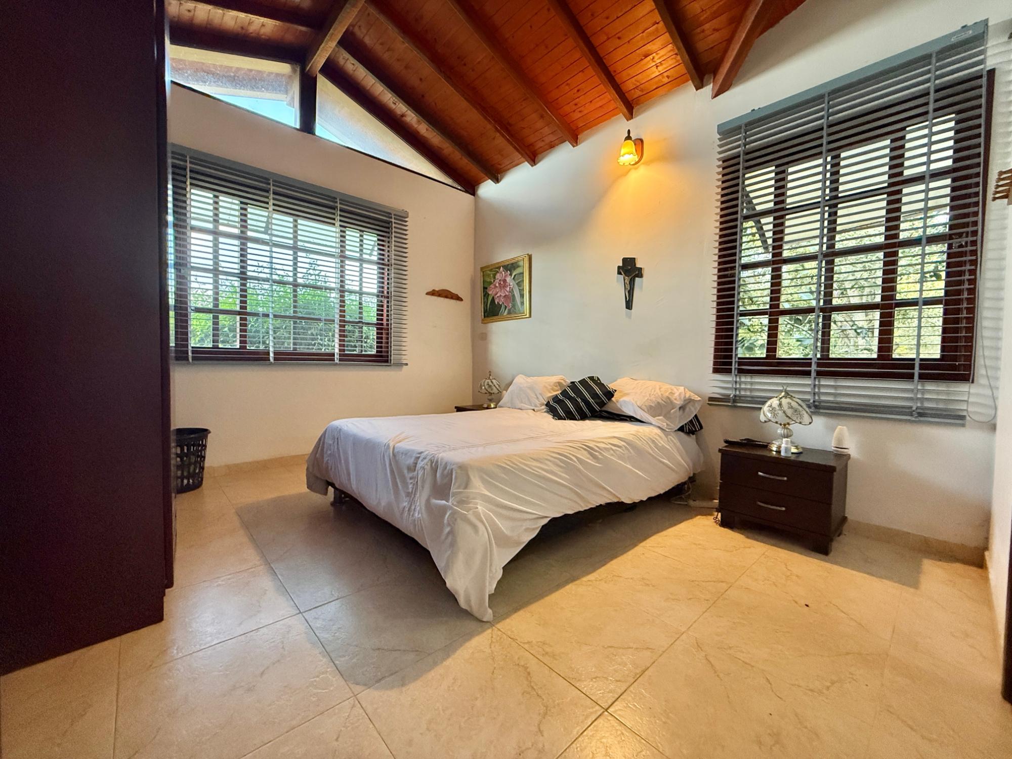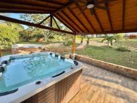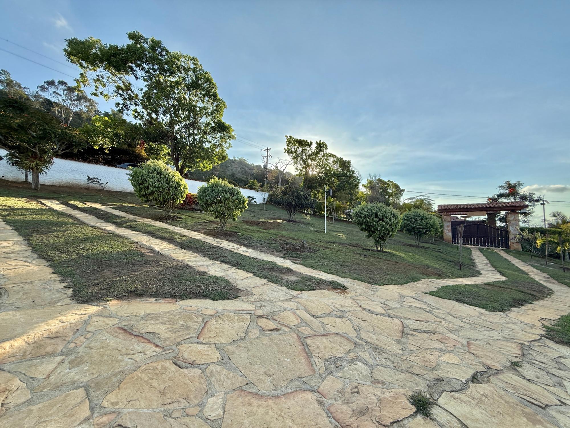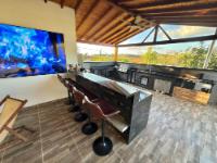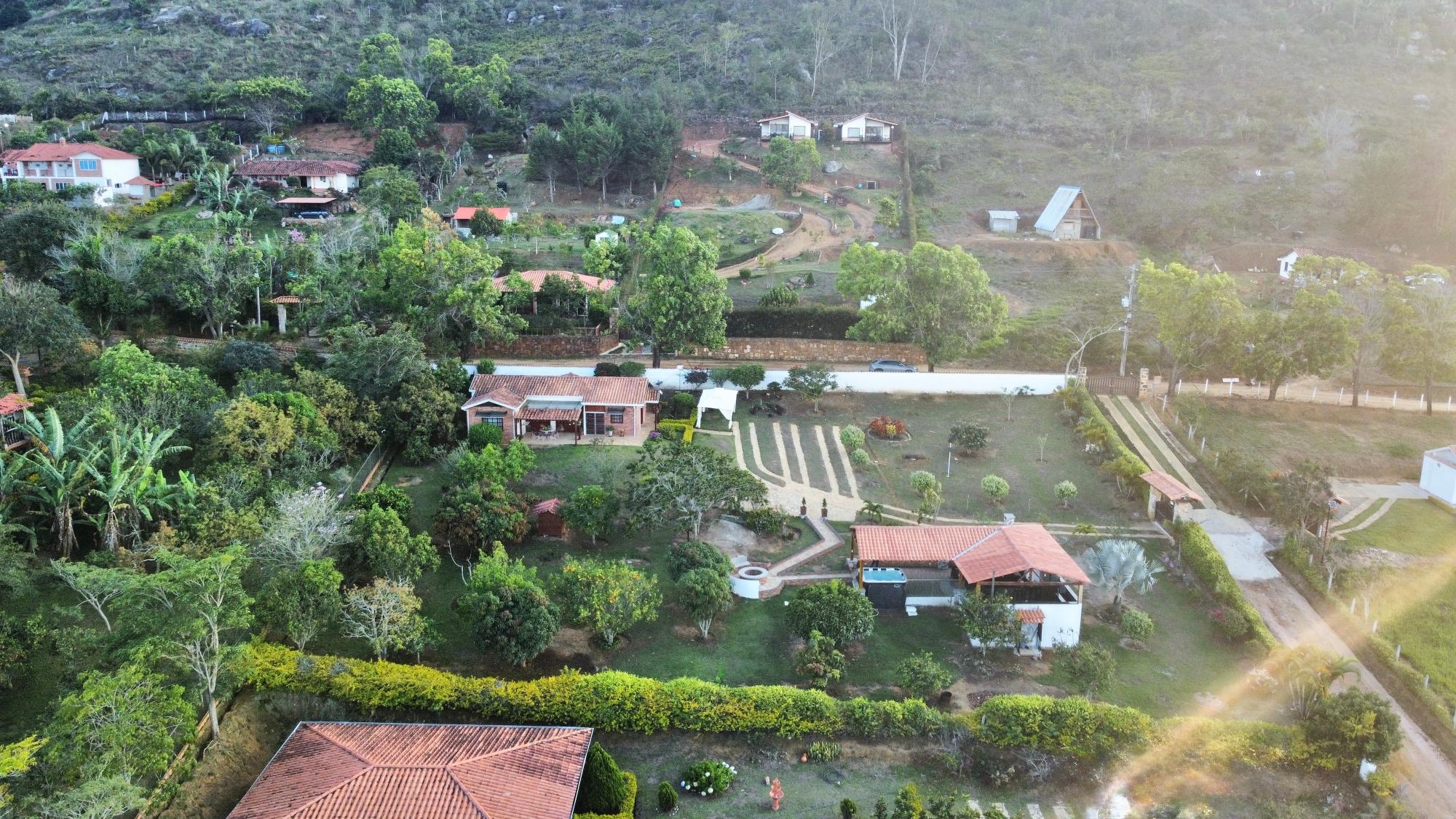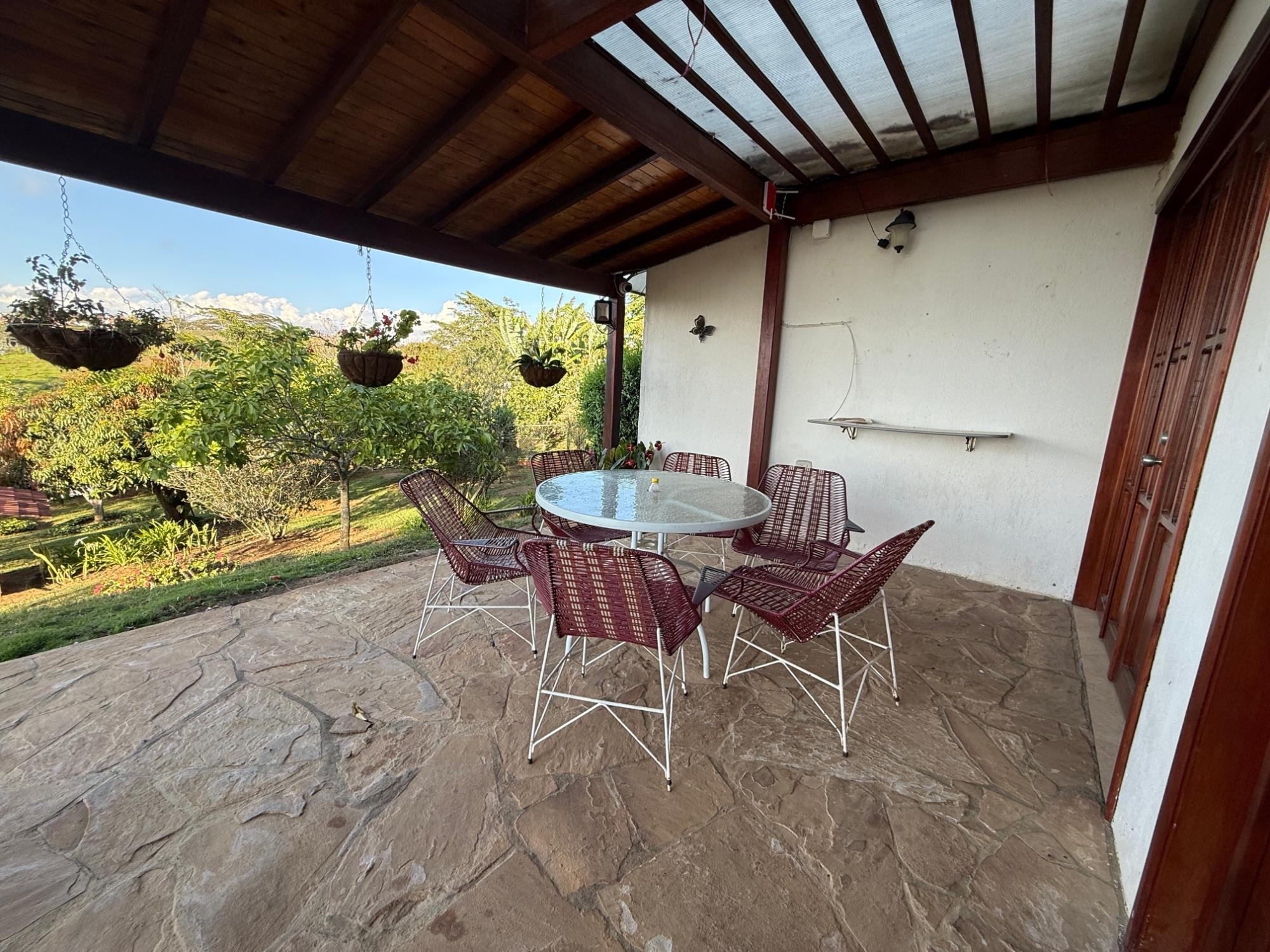 Beautiful villa with a well-maintained 3-bedroom house on the upper level, ample parking for vehicles, some fruit trees, and a recently constructed fire pit area, a super kiosk for enjoying family gatherings with a jacuzzi, a large living room with a fireplace, a spacious bathroom with hot water service, an American bar with its respective chairs, and a large kitchen with a built-in wood-fired oven, gas grill, stove, storage cabinets, and a refrigerator.
