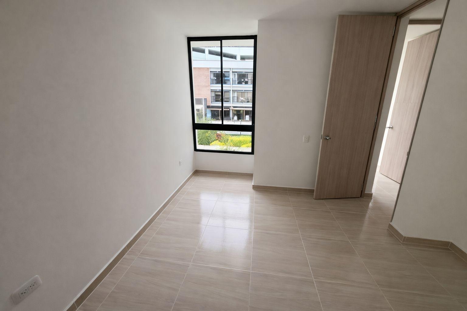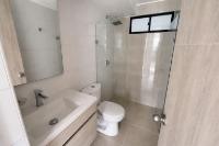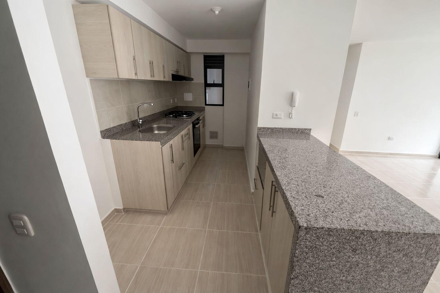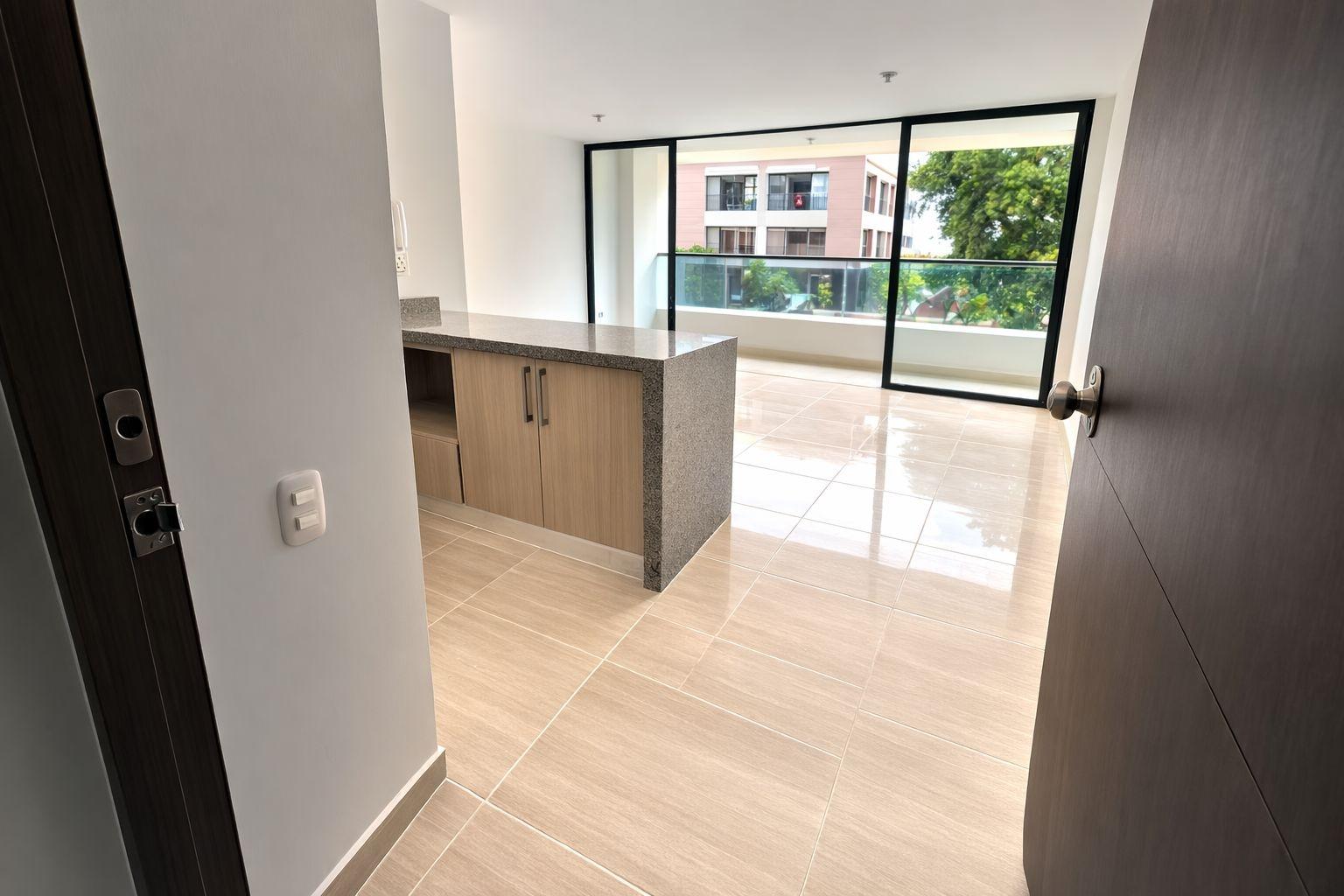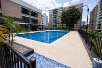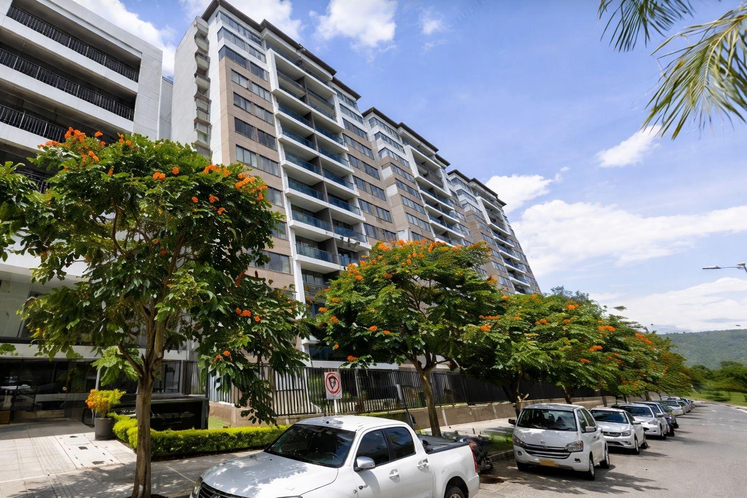 Apartment for sale in Piedecuesta, Bosques del Hato residential complex, Phase 2. It features a fully equipped kitchen with a marble breakfast bar, a living/dining room with a balcony overlooking the pool, a master bedroom with closets and an ensuite bathroom, two additional bedrooms with closets, a shared bathroom, and a laundry area. The complex offers a complete social area with 24/7 security, a swimming pool, a children's playground, a social room for meetings, two assigned parking spaces, and an elevator. Available for investment.