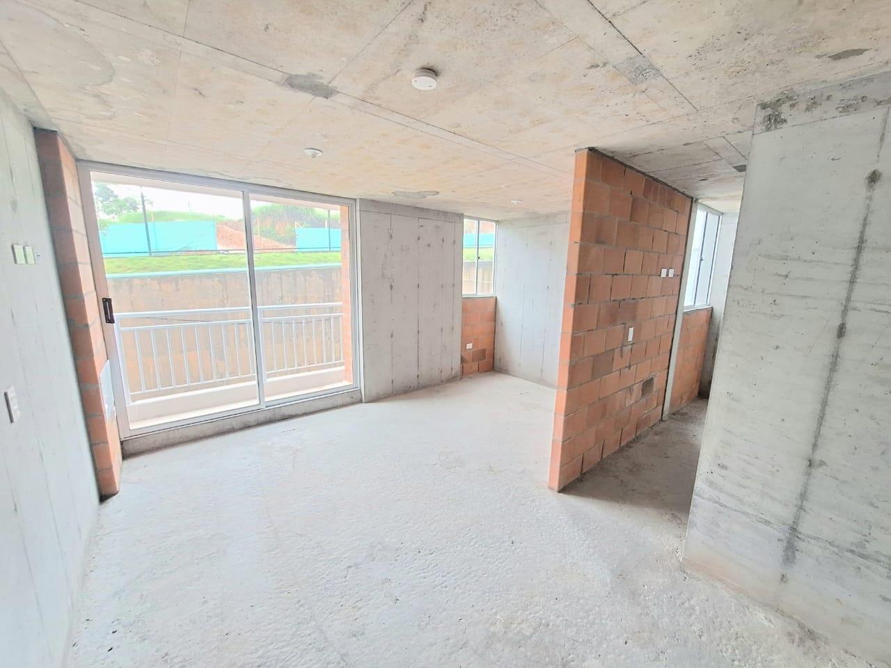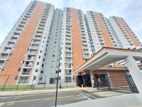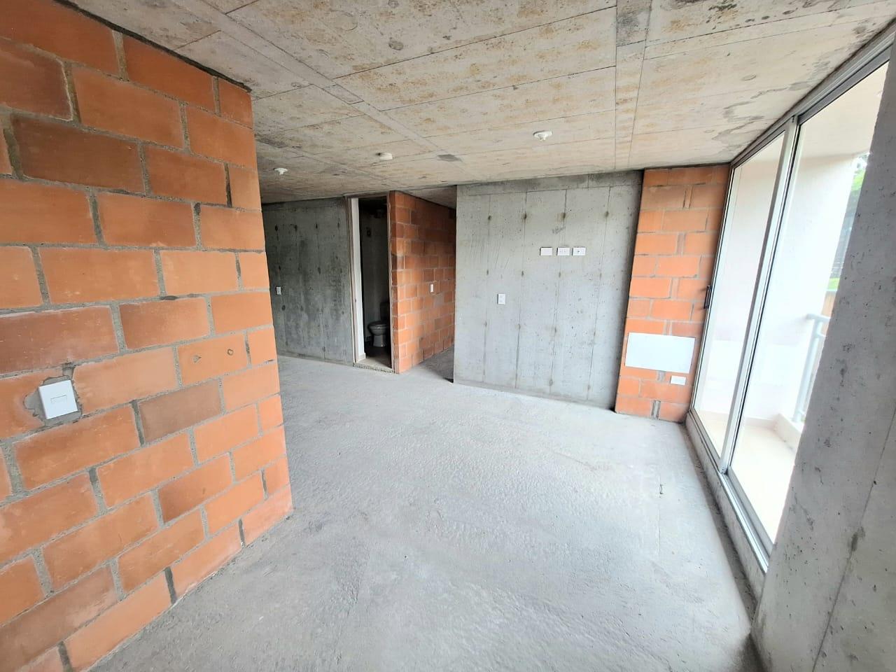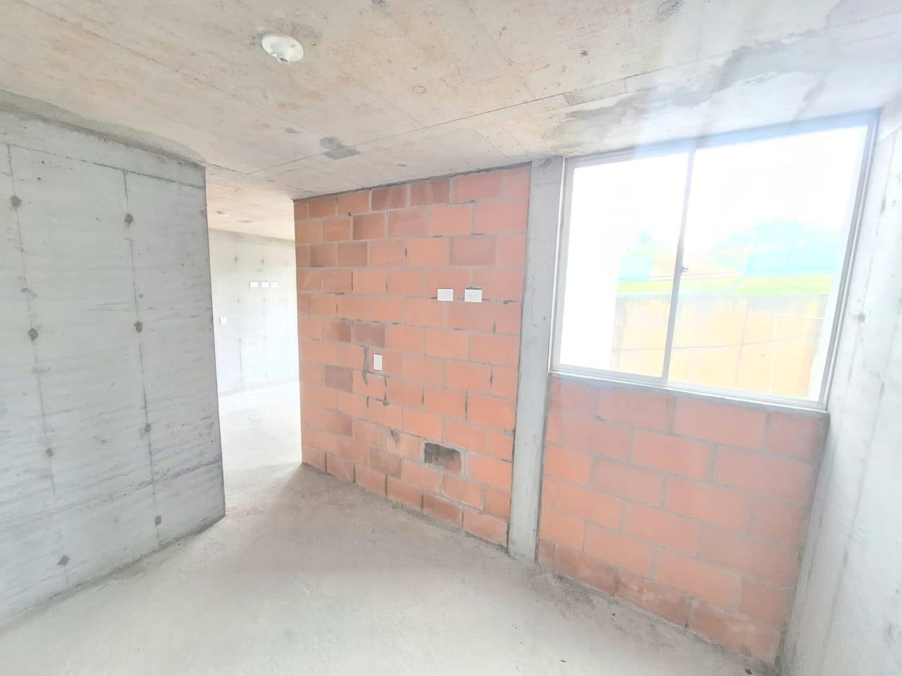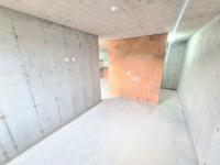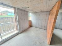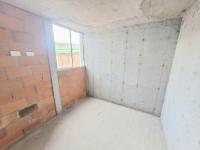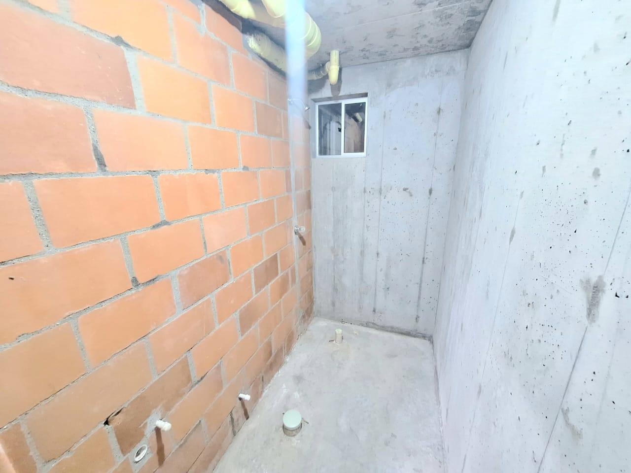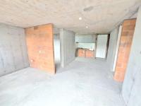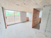 This unfinished apartment is ideal for personal customization. Upon entering, to the left, there is a small study area. To the right is the kitchen, followed by the laundry area. Directly across from the entrance is the living/dining room and a balcony with an exterior view. To the right of the living room is a bedroom without a door. Next to it is a TV room that could also be converted into a bedroom. To the left of the living room is a guest bathroom with a shower and a door. Next to the guest bathroom is the master bedroom with an en-suite bathroom and shower. The other two bathrooms are currently without doors. The complex will feature communal parking, a swimming pool, a children's playground, a social hall, a multi-sports court, and 24-hour security.